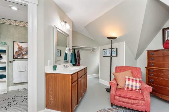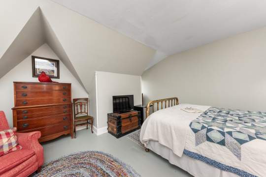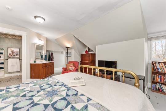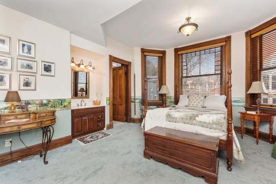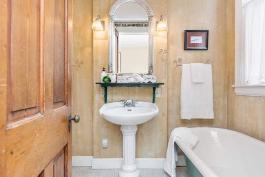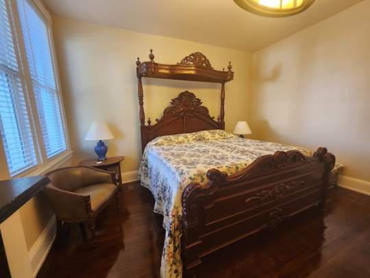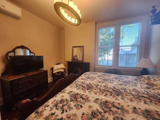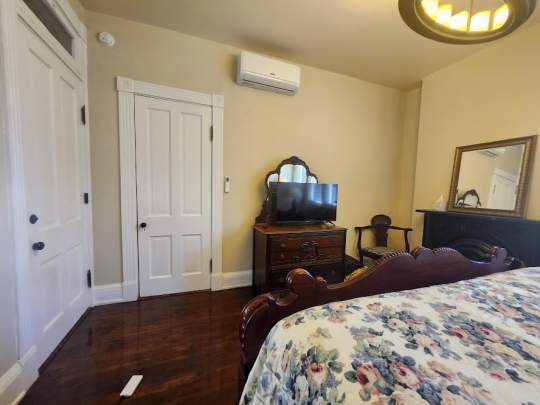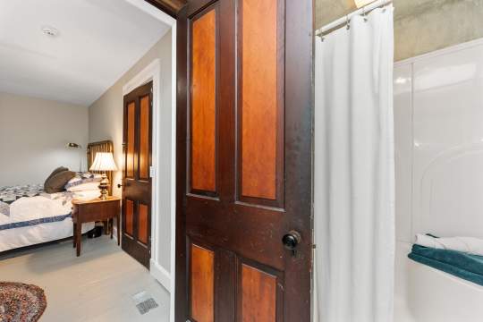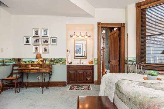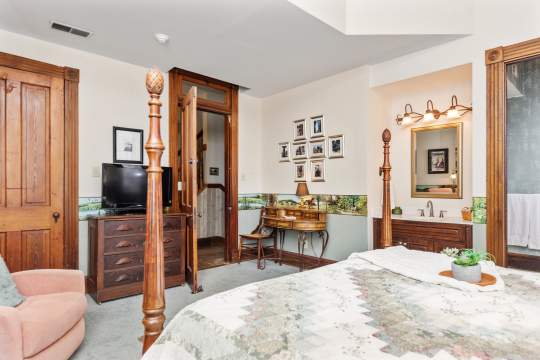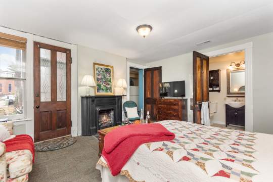 Tucked away upstairs, the Second Floor Rear room is cozy, private, and designed for quiet relaxation. A deluxe queen bed and private bath ensure you have everything you need for a comfortable stay. Ideal for those seeking a quiet, private retreat with cozy comfort and a restful atmosphere.